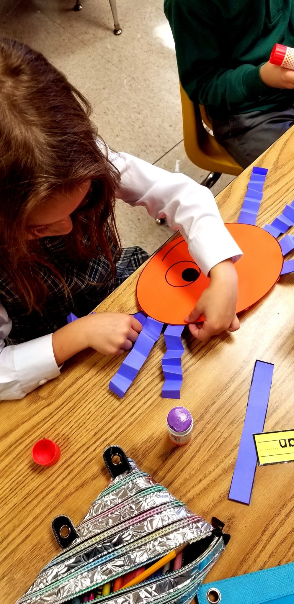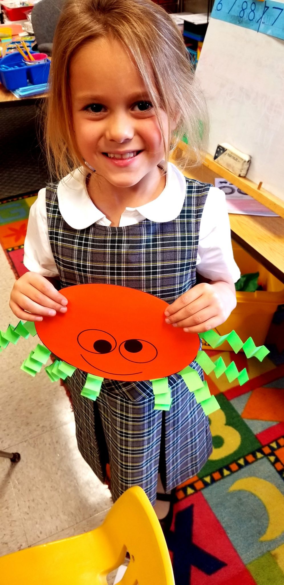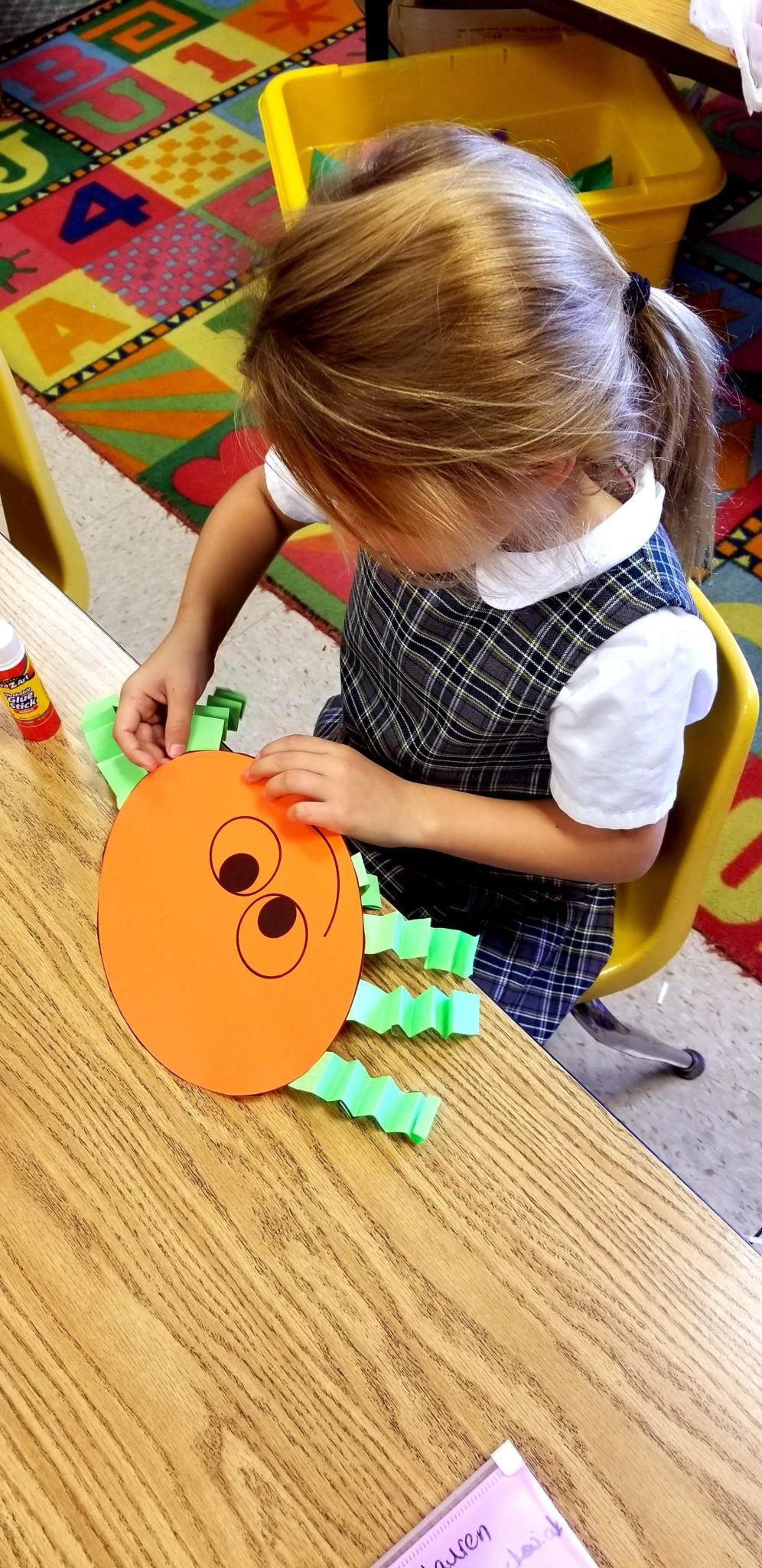 We aren’t! Today we made some silly counting spiders and practiced lots of skills. We worked on following directions, cutting on curved lines, and fan folding. We practiced counting, writing, and ordering numbers to 8. Next week we will learn some spider facts!