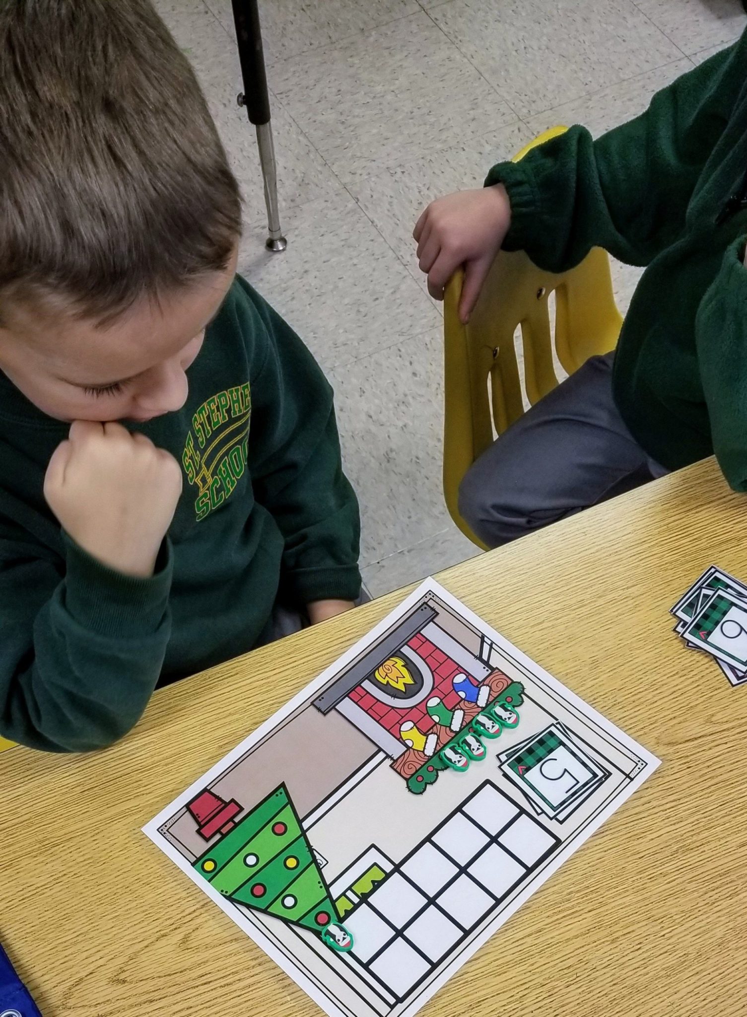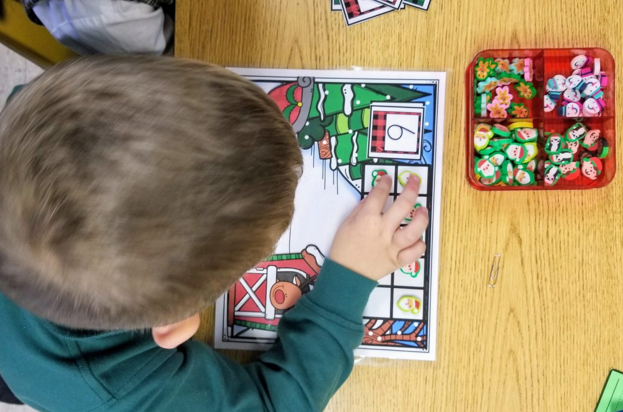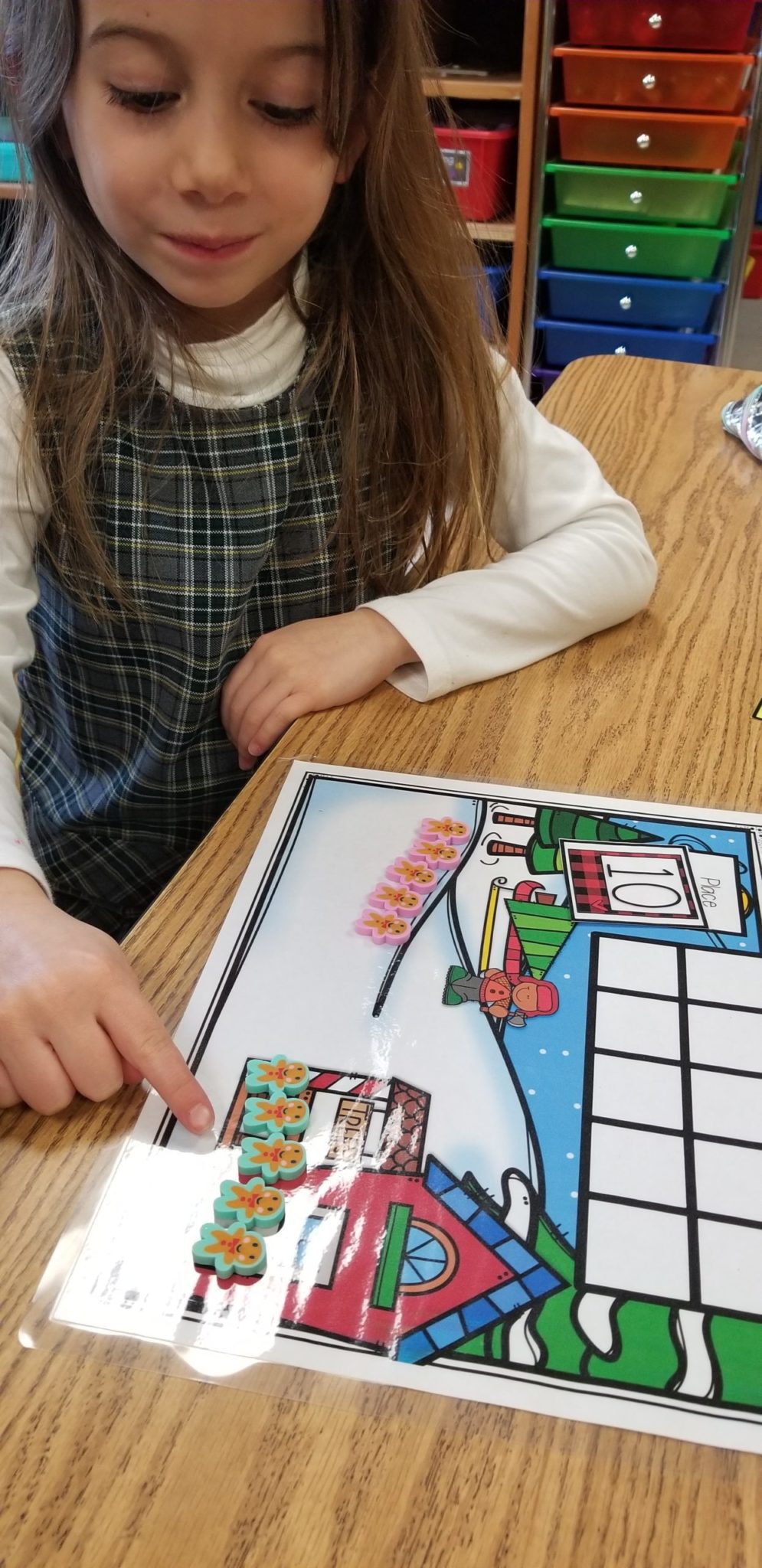 We are starting to build a foundation for addition and subtraction by learning to compose and decompose numbers. Today we learned to play a new math center game. We picked a number card from 4 -10 and counted that many mini erasers in a ten frame. We showed how to decompose the number by breaking the group into two smaller groups. We told our partner how many mini erasers were in each smaller group. You can practice this with your child at home with coins, buttons, goldfish crackers, or other small items!