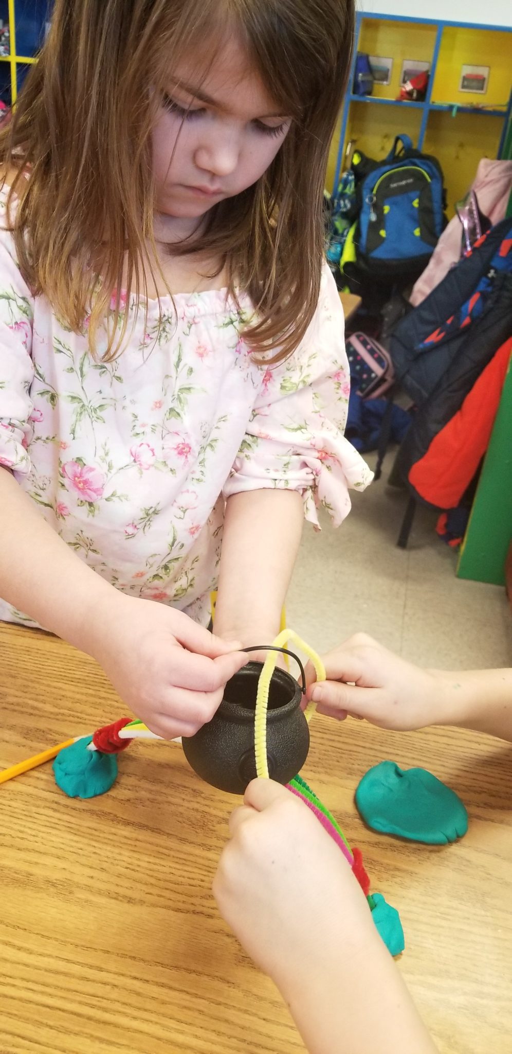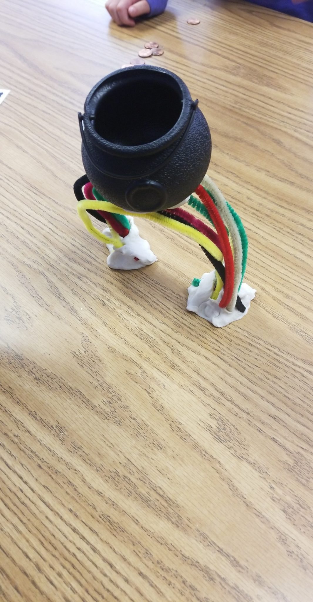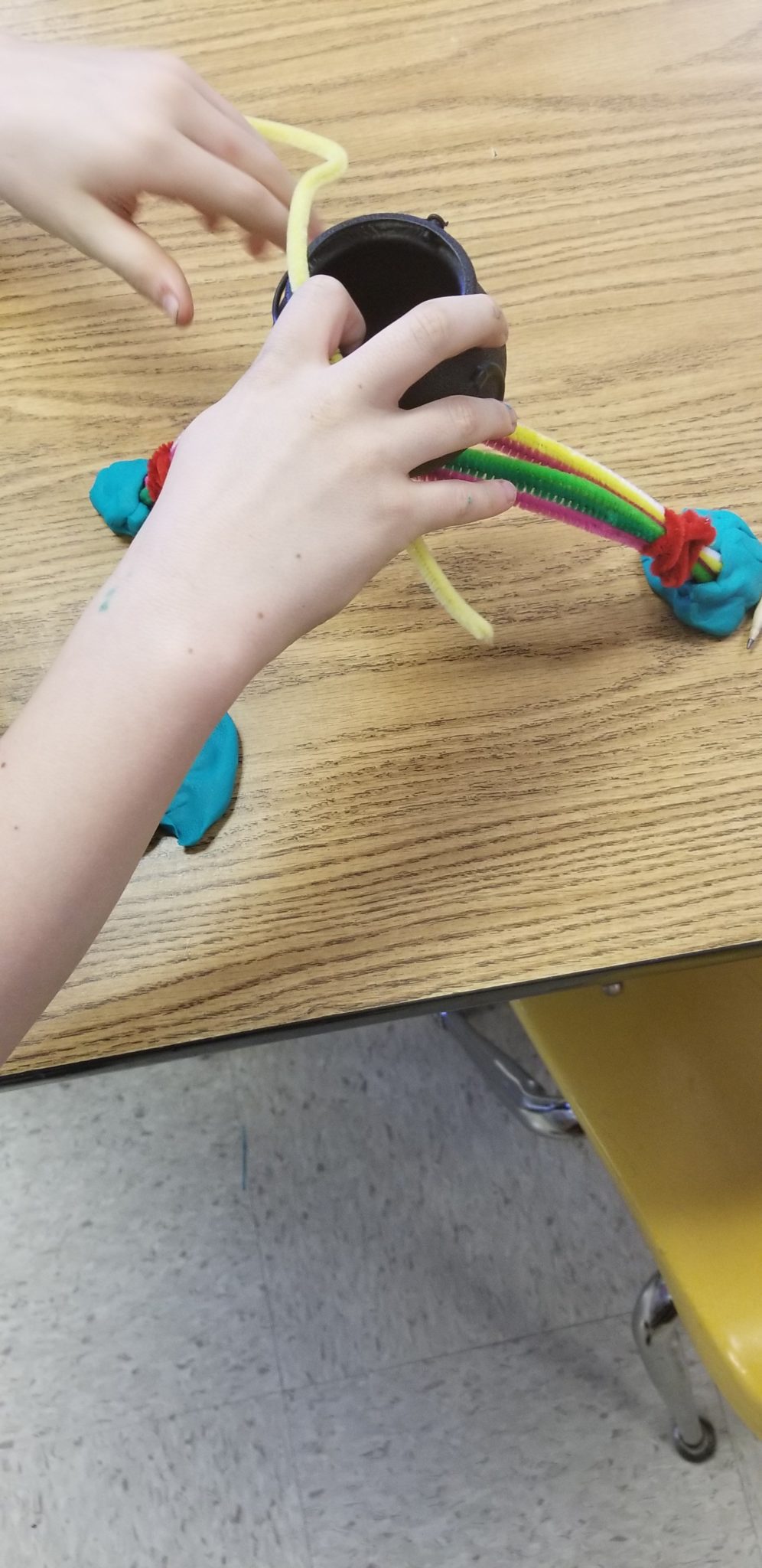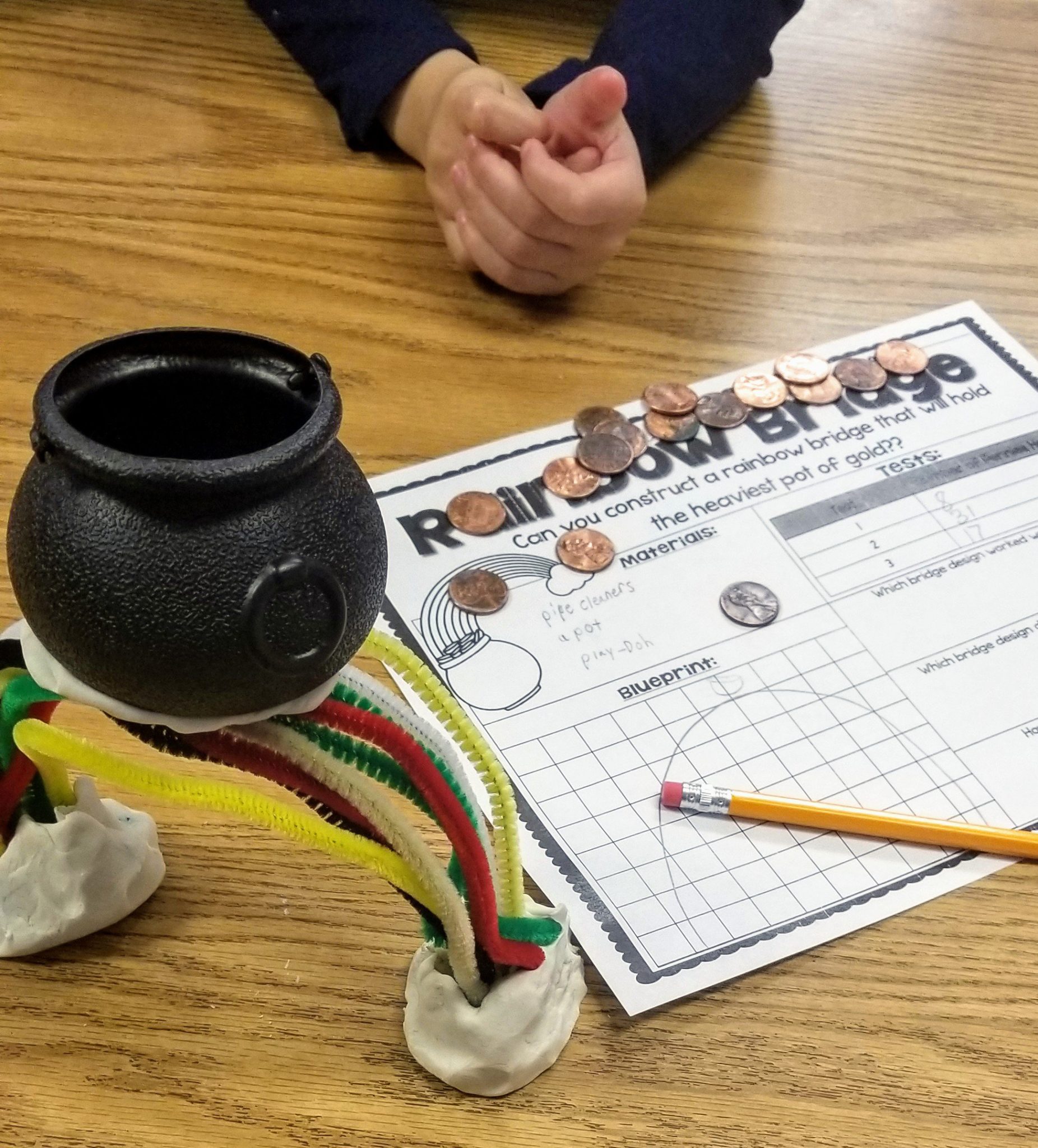 Today we began new STREAM academies! This week’s challenge was for groups to use pipe cleaners and Play-Doh to build a rainbow bridge that could hold a pot with the most pennies before the bridge collapsed or the pot fell off. Before starting, we discussed the important elements of bridge design and learned the words pier, deck, support, and arch. Students then discussed what the bridge should look like, how to build it, and made a quick sketch. After building the bridge, each group tested their design to see how many pennies their pot could hold. Once the pot fell off or the bridge collapsed, the groups discussed what went wrong and how to improve the design. They made adjustments and tested the bridge again. One team’s bridge was able to hold up a pot with 31 pennies!