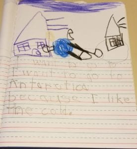 To introduce Antarctica, we read “If You Could Go to Antarctica”. We talked about how the Arctic and Antarctica are alike and different. We wrote, illustrated, and read our sentences to tell whether or not we would want to go to Antarctica.